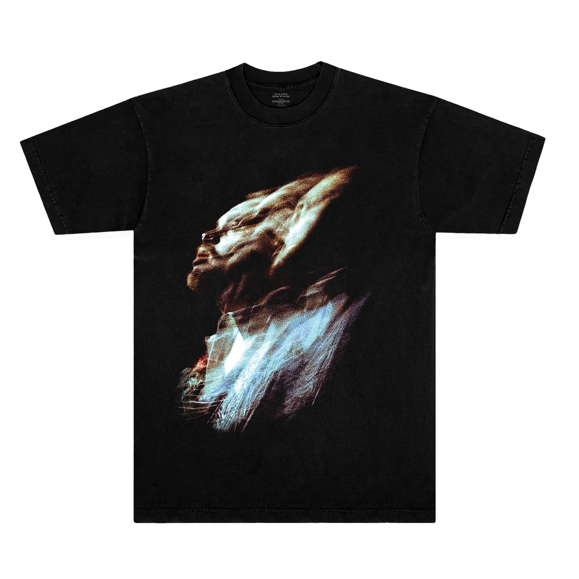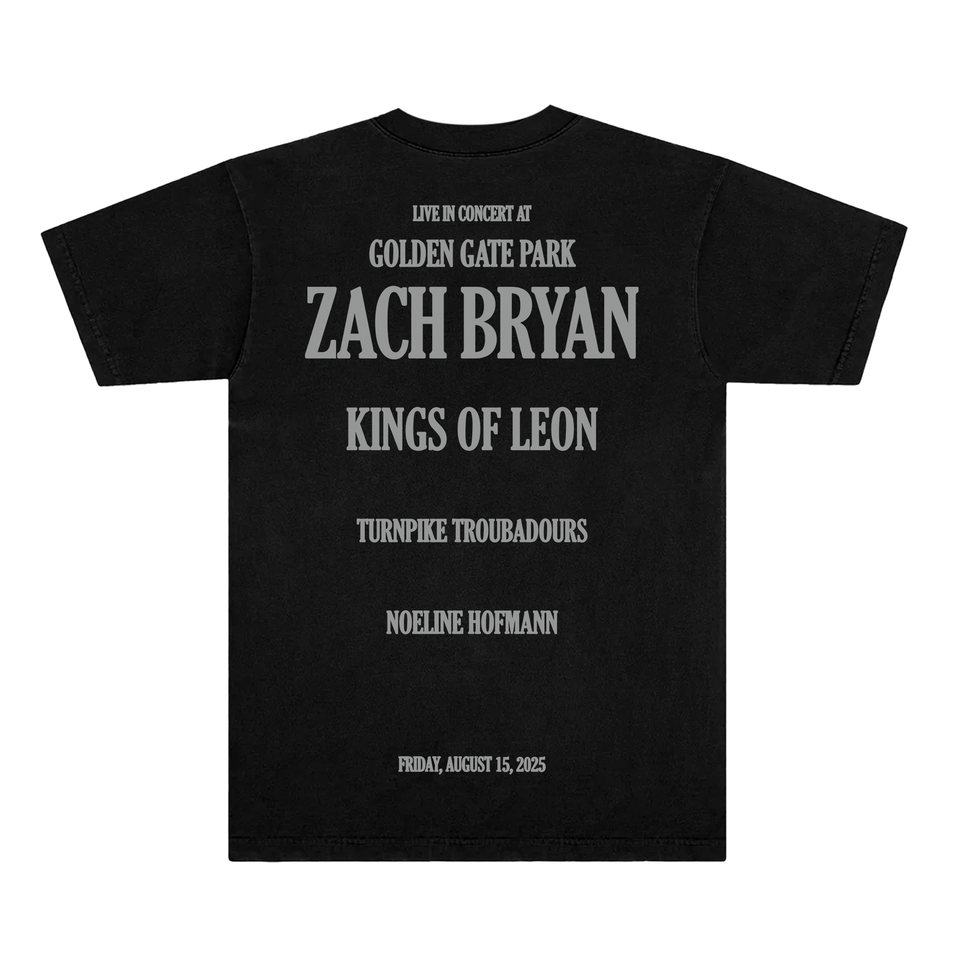Zach Bryan black tee featuring sketch graphic of Zach printed on the front and show details on the back.
