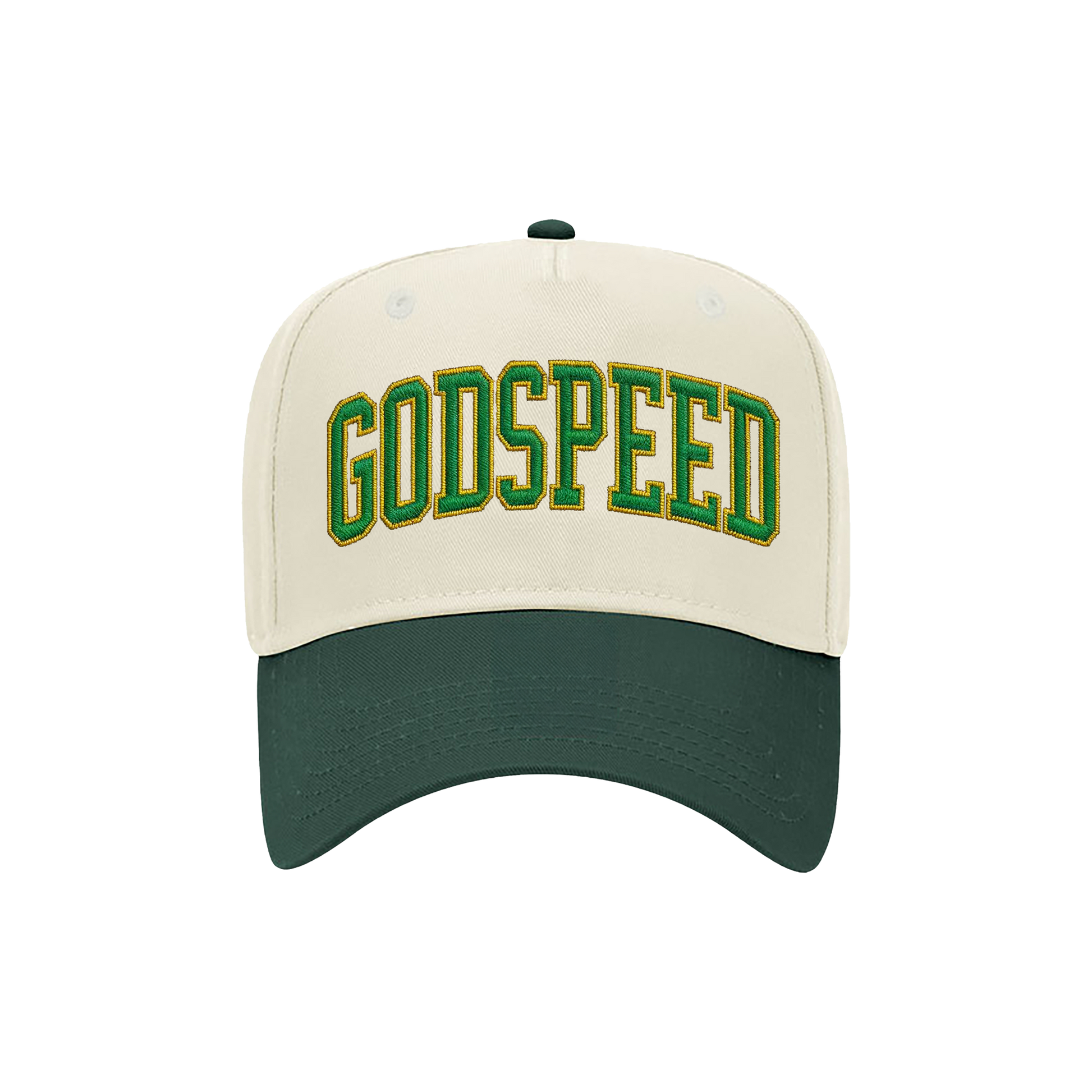 Adjustable natural and green two tone hat in the Notre Dame colorway, featuring ‘Godspeed’ embroidered on the front.