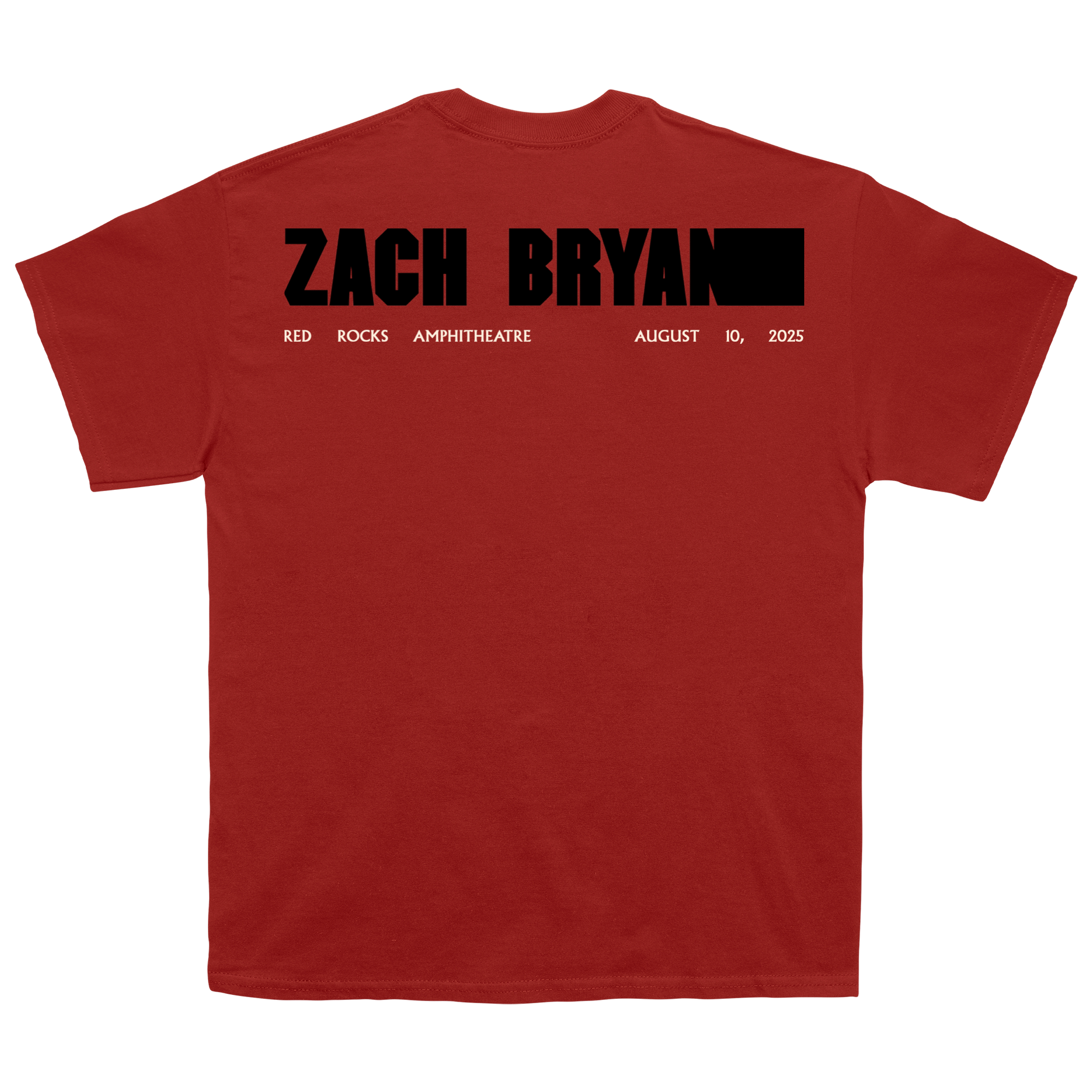 Zach Bryan red tee featuring Red Rocks Amphitheatre design on the front, and logo design on the back.